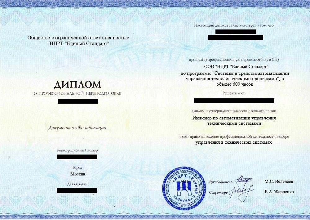 • «Инженер по автоматизации управления техническими системами» с правом работы в сфере управления в технических системах